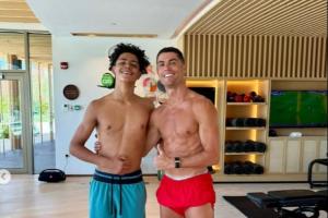两个半月前,C罗在INS上发布了一条动态,是他和儿子迷你罗训练完之后的两张合影,从第一张图来看,迷你罗似乎比C罗还更高了,但仔细看的话C罗的双腿打得比较开,所以这张图很难看得出来两人谁更高。不过从第二张合影来看,C罗似乎是要更高一点的。