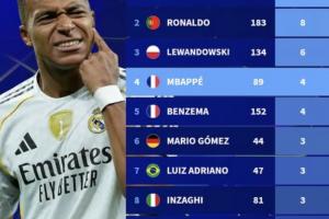 欧冠历史帽子戏法次数榜:梅西、C罗8次最多,姆巴佩4次第4