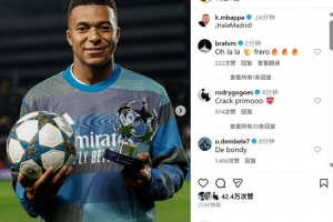 上演帽子戏法,姆巴佩社媒晒与全场最佳奖杯、比赛用球合影