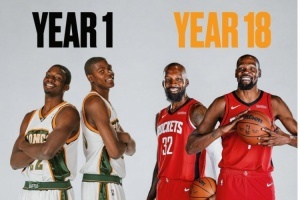 美媒晒新秀赛季杰夫-格林与KD合拍定妆照与今年对比:一个轮回