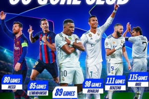 欧冠60球最快用时榜:梅西80场居首,姆巴佩89场第三,C罗98场