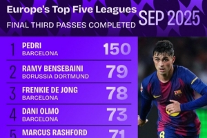 体育资讯10月1日讯 巴萨在9月份的6场比赛中,取得5胜1平。其中巴萨中场佩德里功不可没,他被喻为哈维和伊涅斯塔的结合体。据Squawka数据统计,在9月份欧洲五大联赛进攻三区成功传球次数榜单中,佩德里以150次断崖领先。