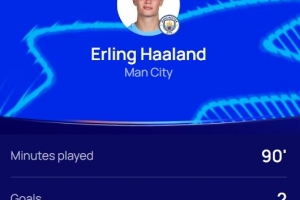 梅开二度!官方:哈兰德当选曼城2-2摩纳哥全场最佳球员