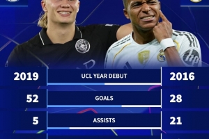 哈兰德vs姆巴佩前50场欧冠数据对比:进球52-28,助攻5-21