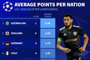 欧冠各国球队平均积分:阿塞拜疆6分最高,英格兰、德国二三位