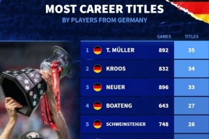 德国球员冠军榜:穆勒35冠居首,克罗斯34冠、诺伊尔33冠