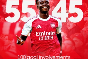 里程碑!英超官方社媒晒海报祝贺萨卡:参与英超进球100个
