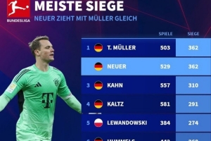 体育资讯10月5日讯 德转统计了德甲球员获胜场次排名,诺伊尔362场追平托马斯-穆勒,并列第一。