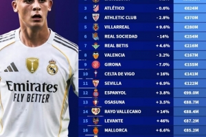 体育资讯10月5日讯 德转此前更新了西甲球员身价,并盘点了目前西甲球队身价榜,具体如下: