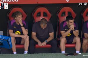 弗里克也不敢看了!莱万罚点瞬间,弗里克替补席上低头不敢看