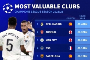 本赛季欧冠球队身价榜:皇马14亿欧居首,阿森纳、曼城、巴黎前四
