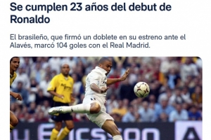 体育资讯10月6日讯 皇马官网撰文表示,今天是巴西传奇前锋大罗在皇家马德里完成首秀的23周年纪念日。