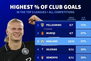 哈兰德进球占比全队57%五大联赛第二高,姆巴佩54%、凯恩47%