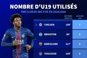 本赛季五大联赛使用U19球员数量:切尔西7人最多,巴萨、巴黎5人