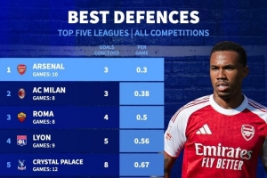五大联赛球队场均失球最少榜:阿森纳0.3球居首,米兰、罗马前三