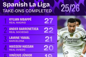 西甲过人次数排行:姆巴佩27次居首 亚马尔第三、维尼修斯第五
