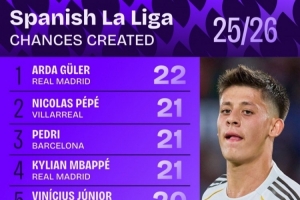 西甲创造机会次数排行:居勒尔22次居首 佩德里、姆巴佩并列第二