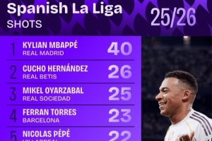 西甲射门次数排行:姆巴佩40次居首 费兰-托雷斯第四、亚马尔第八