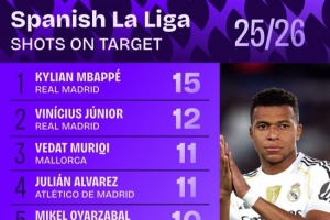 西甲射正次数排行:姆巴佩15次居首 维尼修斯第二、小蜘蛛第四
