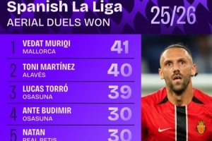 体育资讯10月7日讯 日前,Squawka统计了本赛季西甲争顶成功次数排行,赫伊森21次位居第八。