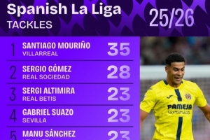 体育资讯10月7日讯 日前,Squawka统计了本赛季西甲抢断次数排行,黄潜后卫S-穆里尼奥35次居首。