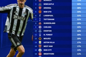 英超各队新援进球占球队总进球比例:利兹联86%最高,阿森纳第4