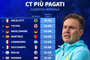 国家队主帅薪水排行榜:安帅950万欧断层第一 卡纳瓦罗400万第四
