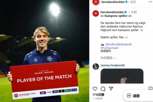 2球1助攻!官方:霍伊伦当选丹麦6-0白俄罗斯队内最佳球员