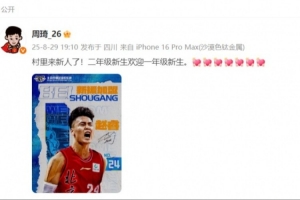 周琦社媒欢迎赵睿:村里来新人了!二年级新生欢迎一年级新生