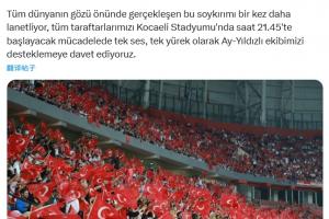 我们再次谴责这场在全世界目光下发生的行为,并邀请所有球迷于晚上9点45分(当地时间)齐聚科贾埃利体育场,以团结一致的声音和心灵支持我们的国家队。