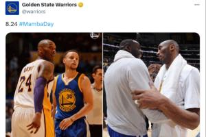 勇士官推晒出了库里和科比、追梦和科比的合照,纪念曼巴日,并写道:“8.24#曼巴日。”