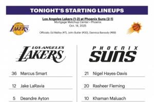 湖人vs太阳先发出炉:东契奇&斯玛特赛季首秀!东艾首次搭档