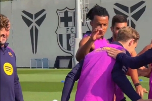 巴萨球员在训练课列队用拍头礼祝贺德容续约、费尔明伤愈归队