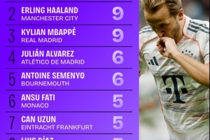 五大联赛射手榜:凯恩11球居首,哈兰德、姆巴佩均9球紧随其后