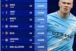 英超身价更新:伊萨克1.4亿欧,维尔茨跌至1.3亿,凯塞多涨至1亿