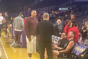 国王新援!威少到场观战 与湖人助教布鲁克斯开心交流