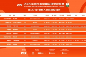 体育资讯10月18日讯 2025华润饮料中甲联赛第27轮裁判选派结果公布,其中苏州东吴vs广东广州豹、南通支云vs广西平果两场焦点战役安排有VAR裁判。