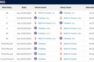 切尔西vs诺丁汉森林战绩:近10场蓝军6胜3平1负,进20球失8球