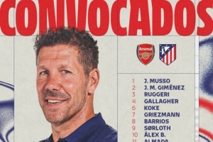 马竞客战阿森纳名单:阿尔瓦雷斯、格列兹曼领衔,卡尔多索缺席