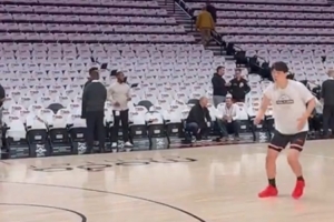 万众期待!杨瀚森身穿中国红战靴迎接常规赛首秀 赛前投篮热身