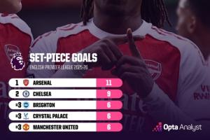 攻城利器!阿森纳本赛季英超已通过定位球打入11球,位列英超第一