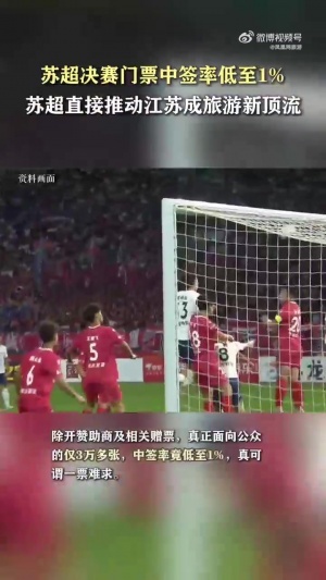 凤凰网表示,据相关数据统计,全网220多万人预约报名,只为一张“苏超”决赛门票,全场超6万的座位,除去赞助商及相关票务需求,真正面向公众的仅3万多张,中签率竟低至1%,远比欧冠决赛门票难抢。