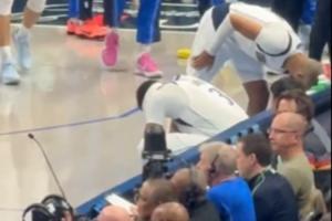 浓眉在场边蹲着抚摸小腿许久 队友们满脸担忧