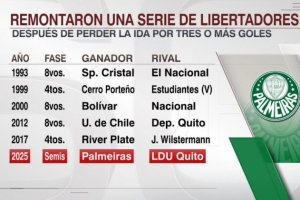 解放者杯首回合净负3球次回合逆转,帕尔梅拉斯是历史第6队