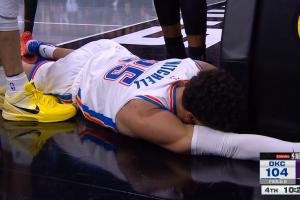 危险!威少被断回防将米切尔推翻在地 一级恶犯!