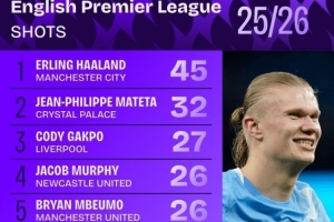 本赛季英超射门榜:哈兰德45次居首,加克波、姆伯莫、萨拉赫在列