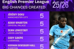 本赛季英超创造重大机会榜:多库、加克波、萨拉赫、佩德罗均5次