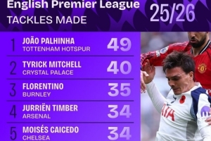 本赛季英超抢断榜:帕利尼亚独自领跑,廷伯、凯塞多在列