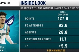 湖人危?拉梅洛·鲍尔出战黄蜂48分钟净负8.5分 缺阵时净胜5.5分