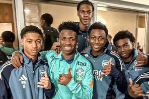 维尼修斯随巴西队在阿森纳基地训练,备战这场友谊赛,他与阿森纳的青训球员合影。